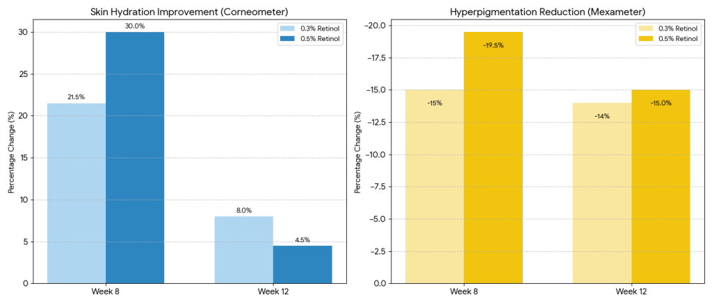 A clinical study comparing 0.3% and 0.5% retinol serums showed that both concentrations improved hydration, pigmentation, and wrinkle depth. Importantly, 0.3% retinol delivered similar long-term benefits with fewer side effects, making it a strong option for consistent nightly use.
