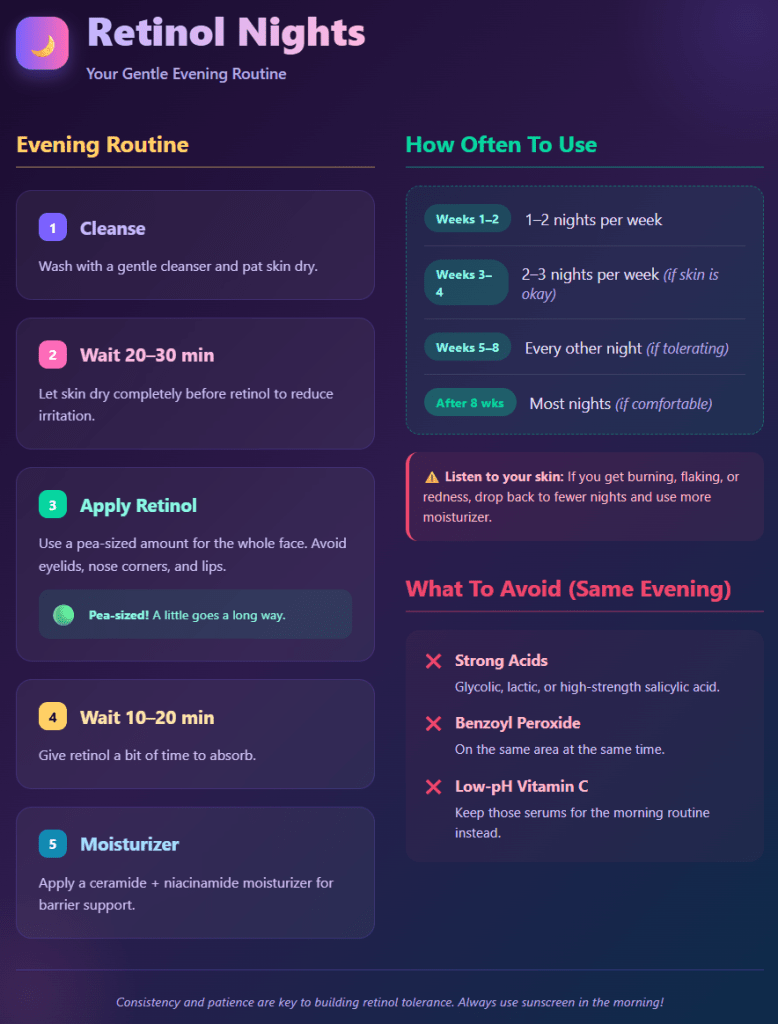 - Avoid stacking strong actives. Do not use retinol at the same time as strong exfoliating acids until your skin has adapted.